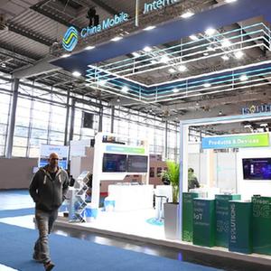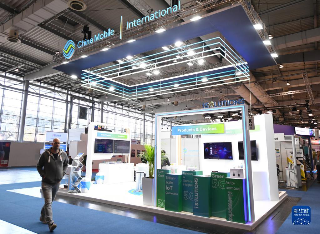 這是4月18日在德國漢諾威工博會上拍攝的中國移動展區。