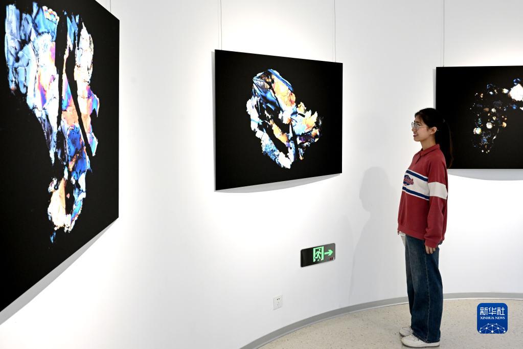 4月19日,觀眾在展覽上觀看月壤顆粒正交偏光顯微照片。
