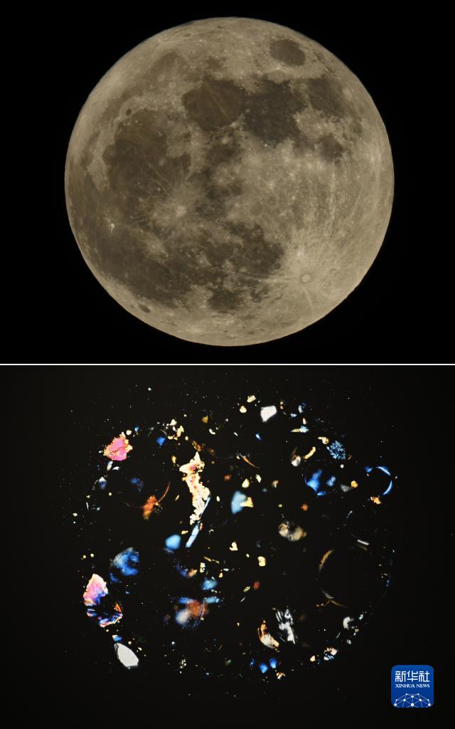 這是一張拼版照片,上圖為2022年6月14日拍攝的“超級月亮”(新華社發 胡攀學攝);下圖為2023年4月19日拍攝的展出中的月壤顆粒正交偏光顯微照片。