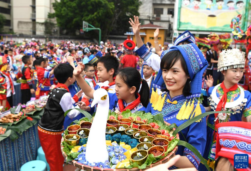 當日,廣西南寧市逸夫小學舉行2023“壯族三月三”暨“鑄牢中華民族共同體意識”主題教育活動。色彩繽紛的民族服裝,民族風情濃郁的歌舞表演,多種多樣的特色美食,讓校園處處洋溢著歡樂。隨著傳統節日“壯族三月三”臨近,廣西各地陸續開展豐富多彩的慶?;顒?。