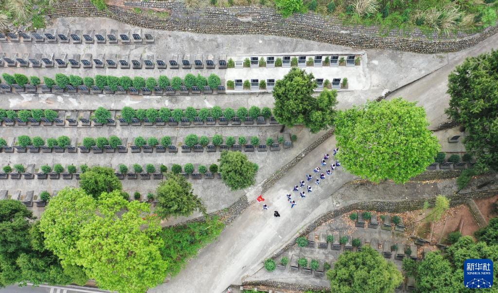 4月18日,馮煉組織學生來到長坪山烈士陵園,向學生講述紅軍故事(無人機照片)。