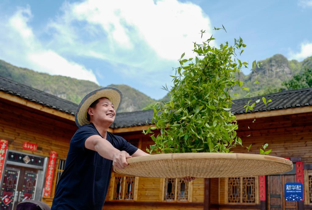 4月19日,重慶市南川區德隆鎮茶樹村一個居民點,制茶工藝傳承人吳科在幫助村民翻曬新鮮茶葉。