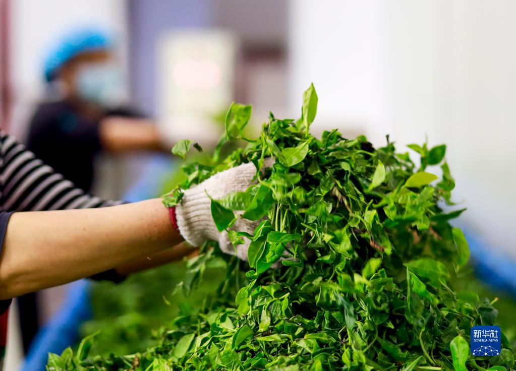 4月18日,重慶市南川區德隆鎮千年金山紅古樹茶的生產車間內,工作人員在將鮮茶葉放入簸箕內進行萎凋。