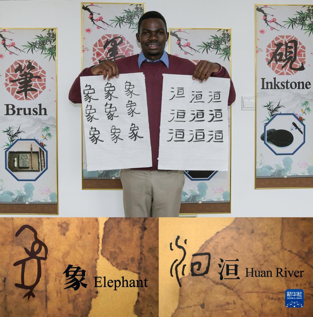 拼版照片:上圖為2023年4月17日,阿瓜塔·阿莫斯·米奇拉在肯尼亞內羅畢大學孔子學院展示他用毛筆書寫的“象”和“洹”字(新華社記者 韓旭 攝);下左圖為2023年4月19日在位于中國河南省安陽市的中國文字博物館拍攝的“象”字甲骨文(左);下右圖為2023年4月19日在位于中國河南省安陽市的中國文字博物館拍攝的“洹”字甲骨文(左)(新華社記者 李安 攝)。