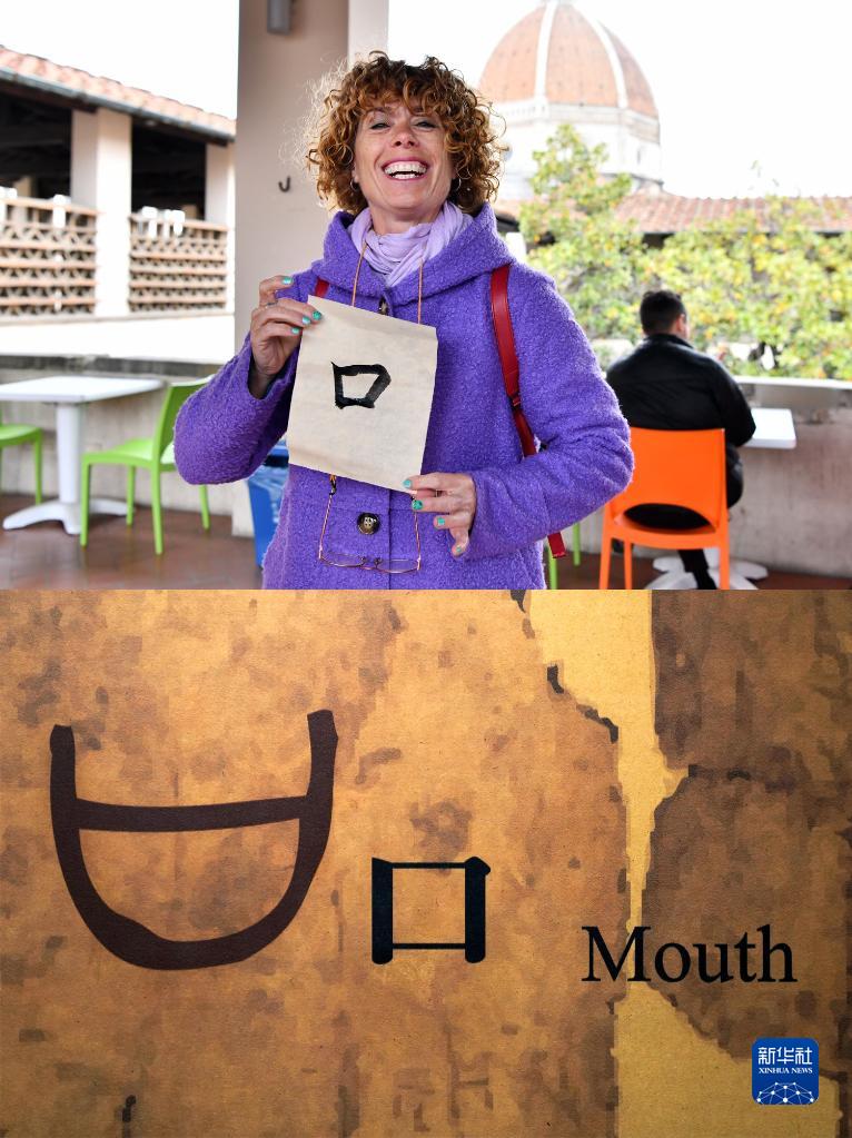 拼版照片:上圖為2023年4月13日,在意大利佛羅倫薩大學孔子學院舉辦的學寫漢字活動上,一名參與者展示她學習書寫的漢字“口”(新華社記者 金馬夢妮 攝);下圖為2023年4月19日在位于中國河南省安陽市的中國文字博物館拍攝的“口”字甲骨文(左)(新華社記者 李安 攝)。