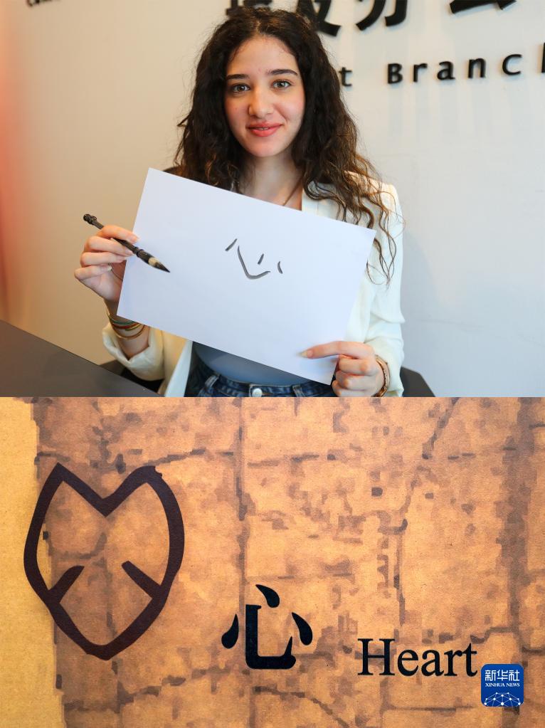 拼版照片:上圖為2023年4月13日,在埃及開羅,阿斯瑪·穆斯塔法·易卜拉欣展示用毛筆書寫的“心”字(新華社記者 隋先凱 攝);下圖為2023年4月19日在位于中國河南省安陽市的中國文字博物館拍攝的“心”字甲骨文(左)(新華社記者 李安 攝)。