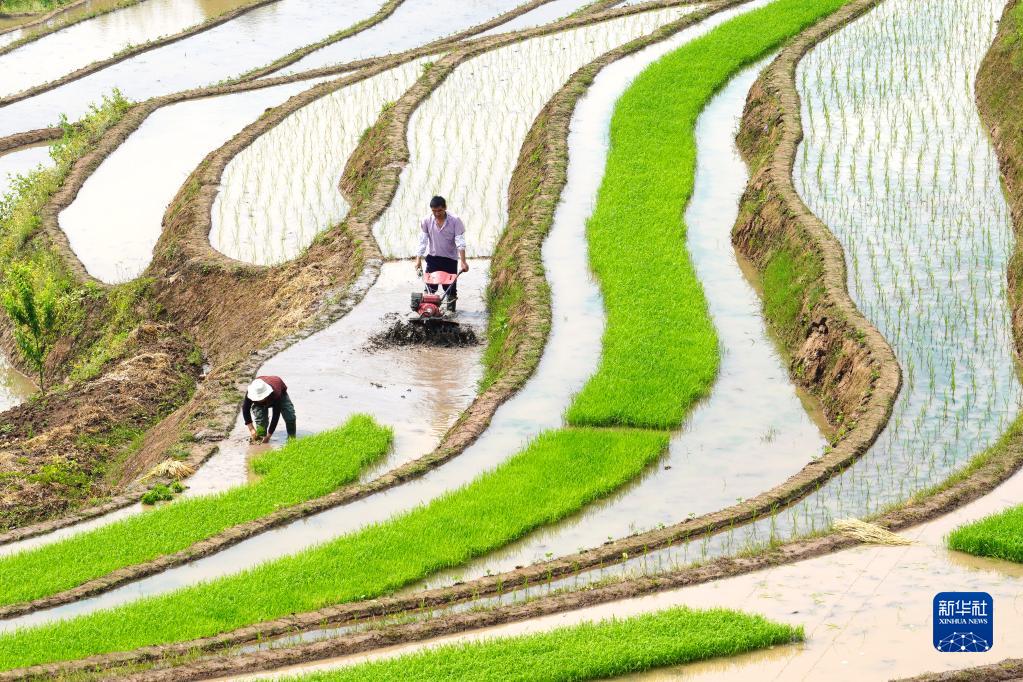 4月20日,云南水富市永安村農民在打理水田、扯秧苗。