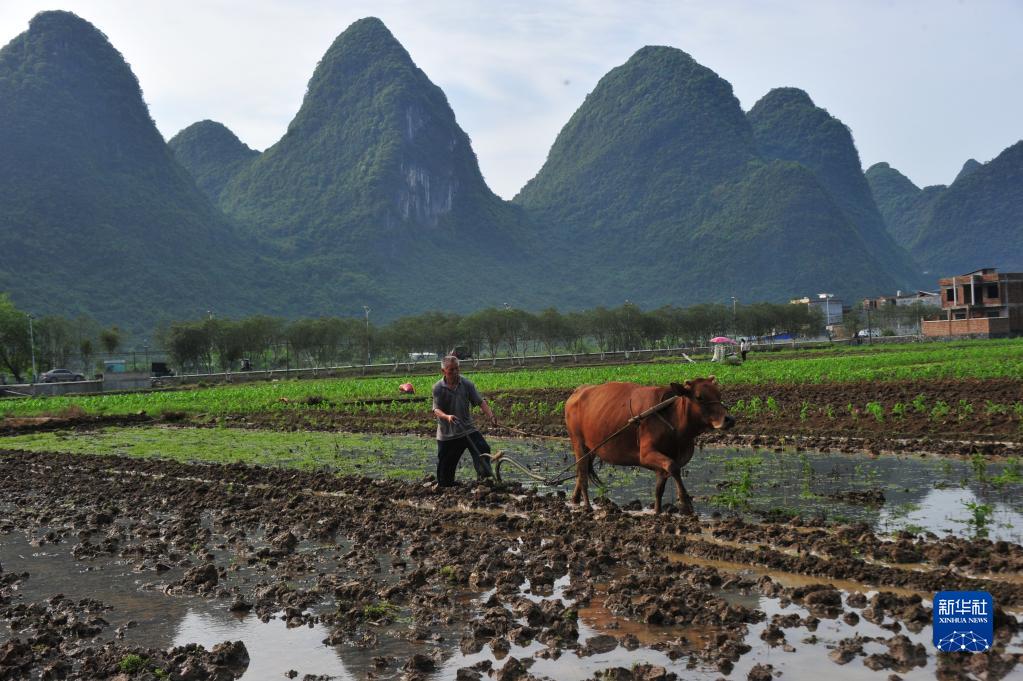 4月20日,廣西河池市羅城縣東門鎮永安村大地賣屯農民在犁田。