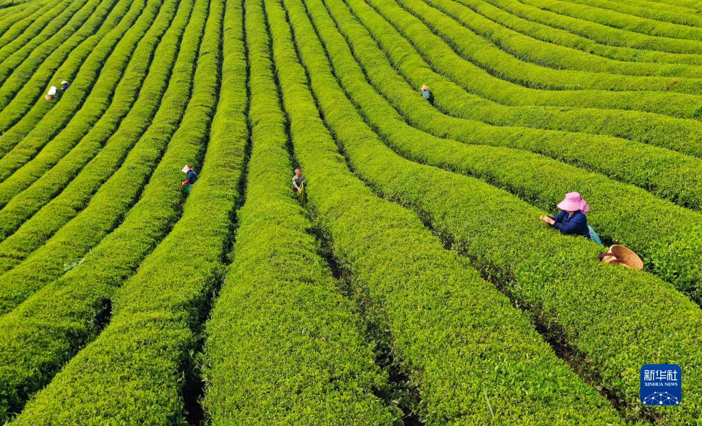 4月20日,茶農在貴州省銅仁市松桃苗族自治縣正大鎮茶園采茶(無人機照片)。