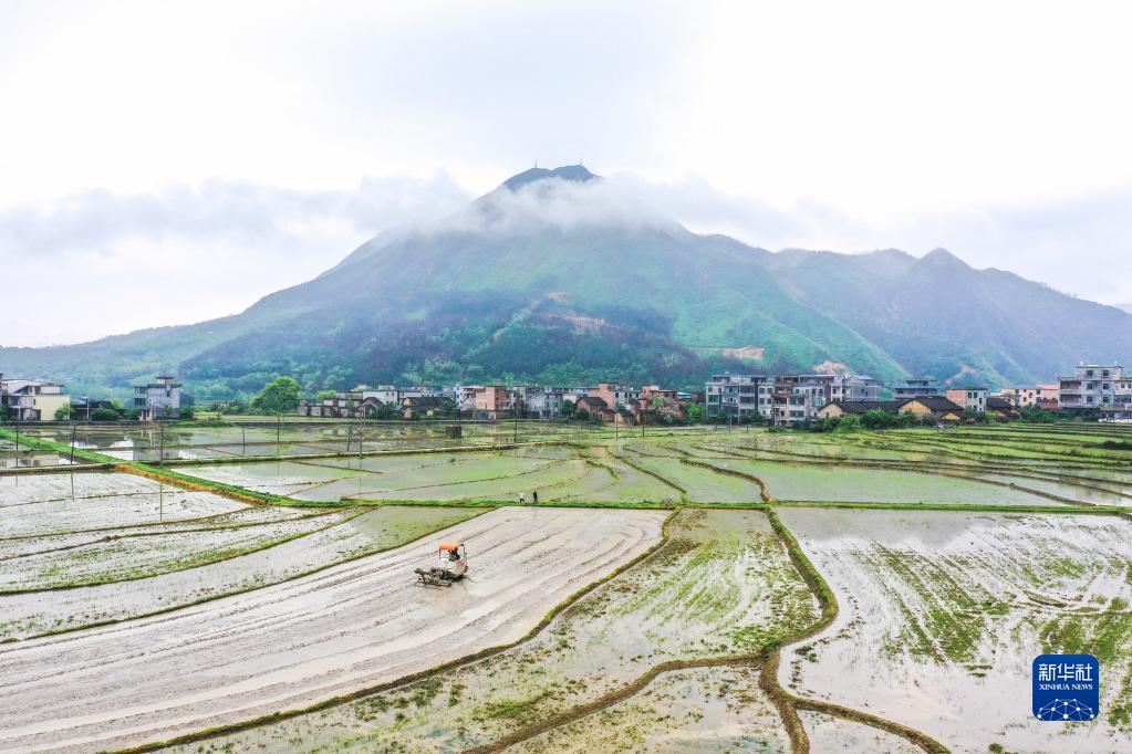 4月20日,在湖南省常寧市廟前鎮雙鳳村,農民駕駛農機在整理田地(無人機照片)。
