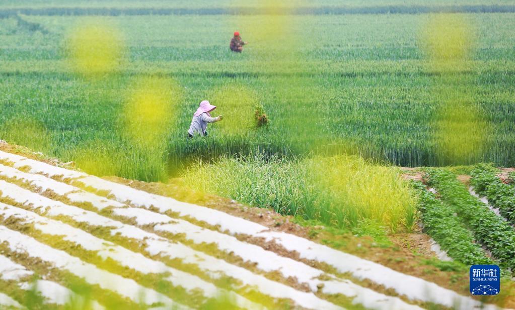 4月20日,農民在山東省滕州市級索鎮麥田里拔草。