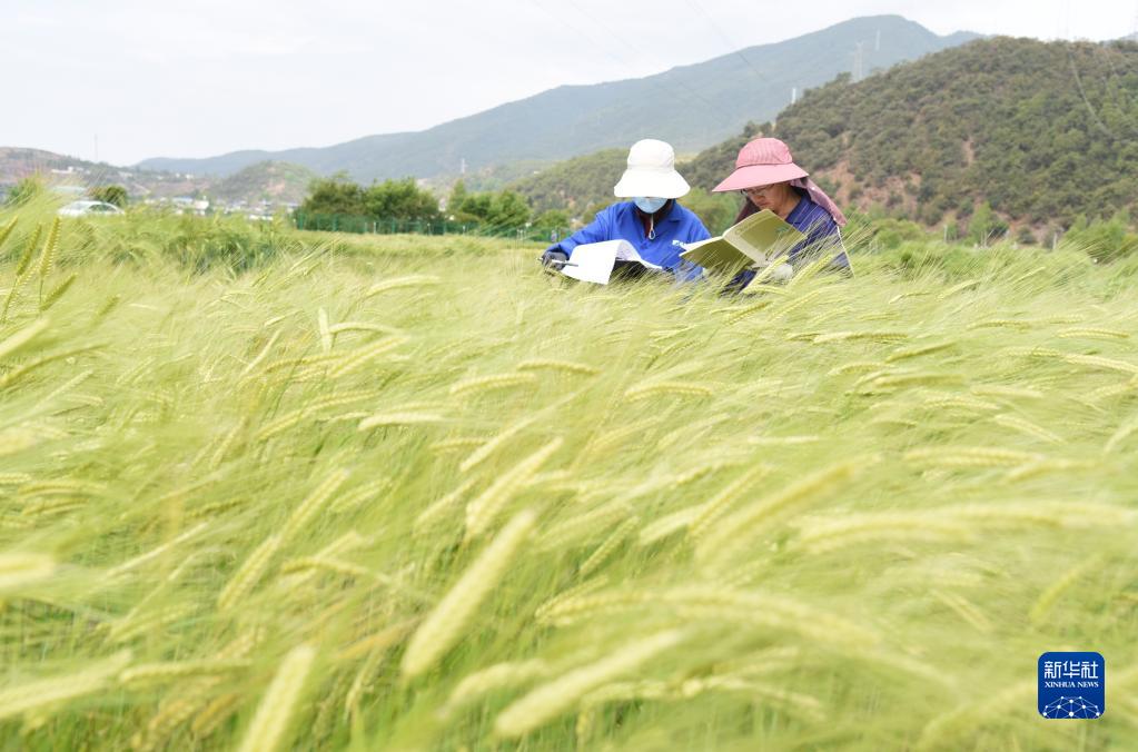 4月20日,在云南省麗江市古城區金山街道新團社區,農技人員在麥田里開展田間調查。