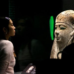 4月20日,觀眾在展覽上觀看木乃伊棺蓋。