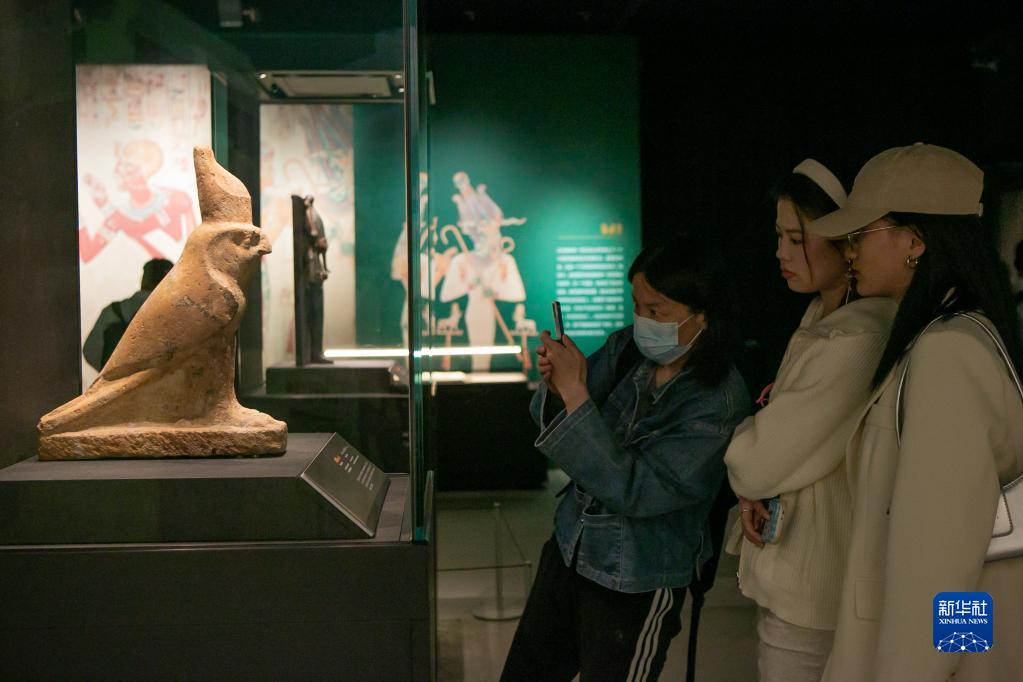 4月20日,觀眾在展覽上觀看荷魯斯雕像。