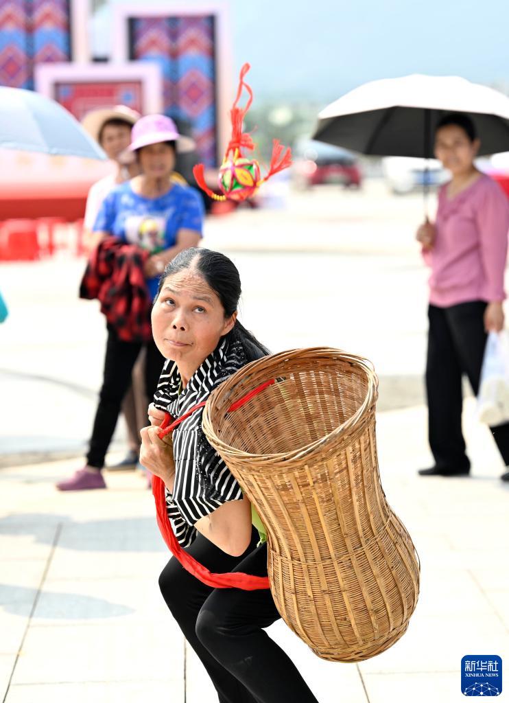 4月20日,在柳城縣鳳山鎮鳳鳴廣場,村民參加拋繡球活動。