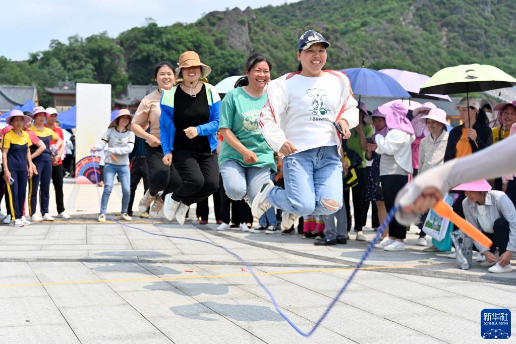 4月20日,在柳城縣鳳山鎮鳳鳴廣場,村民在跳繩。