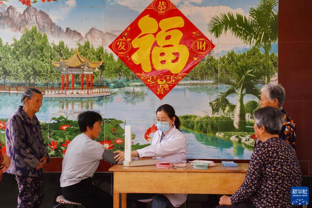 4月20日,河北省平鄉縣尋召村村醫在“幸福小院”內為老人們量血壓。