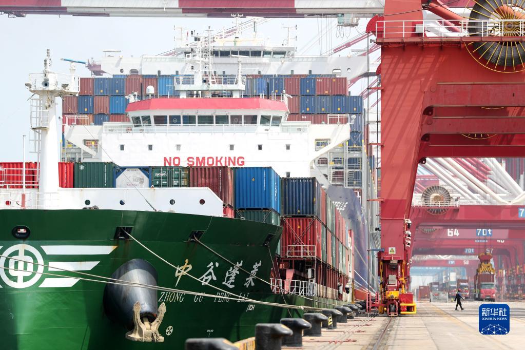 4月20日,在山東港口青島港前灣聯合集裝箱碼頭,一艘貨輪在裝載貨物。