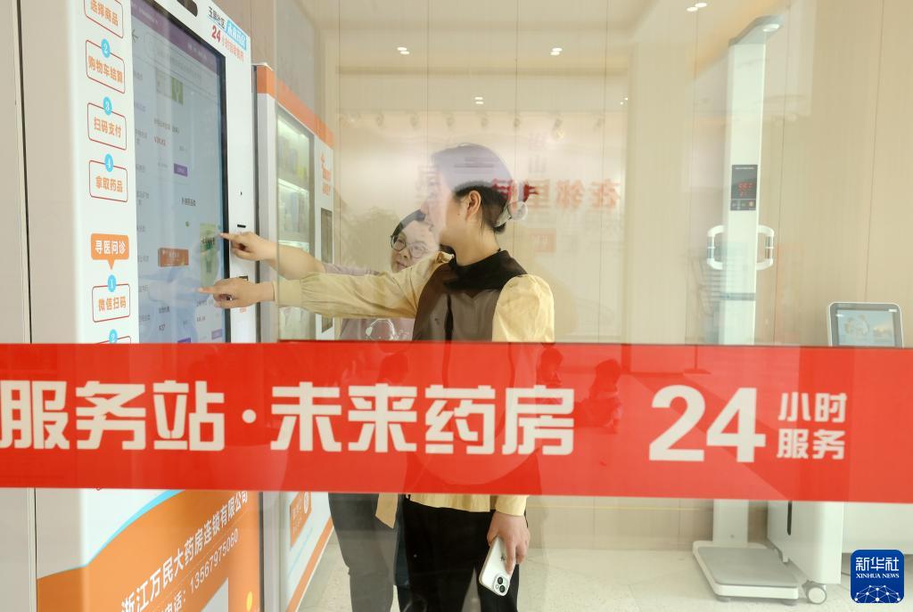 4月20日,居民在湖州市德清縣舞陽街道玉屏未來社區24小時自動售藥機上購買藥品。