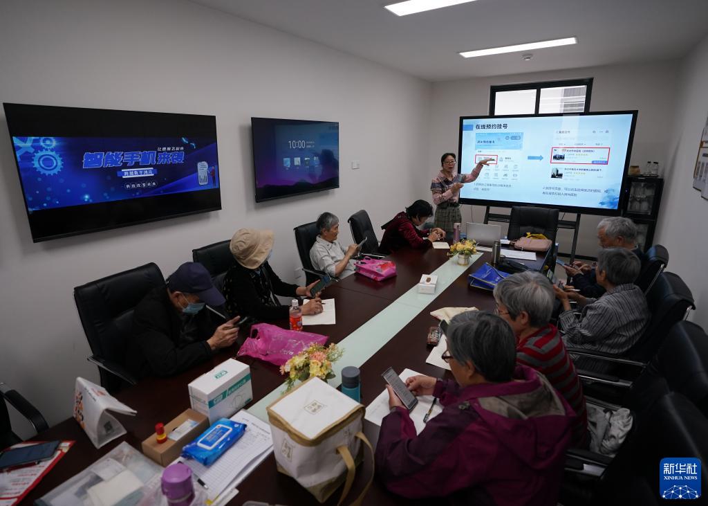 4月20日,志愿者在杭州市西湖區西溪街道求智未來社區為老年居民進行智能手機培訓,教他們通過智能手機預約掛號。