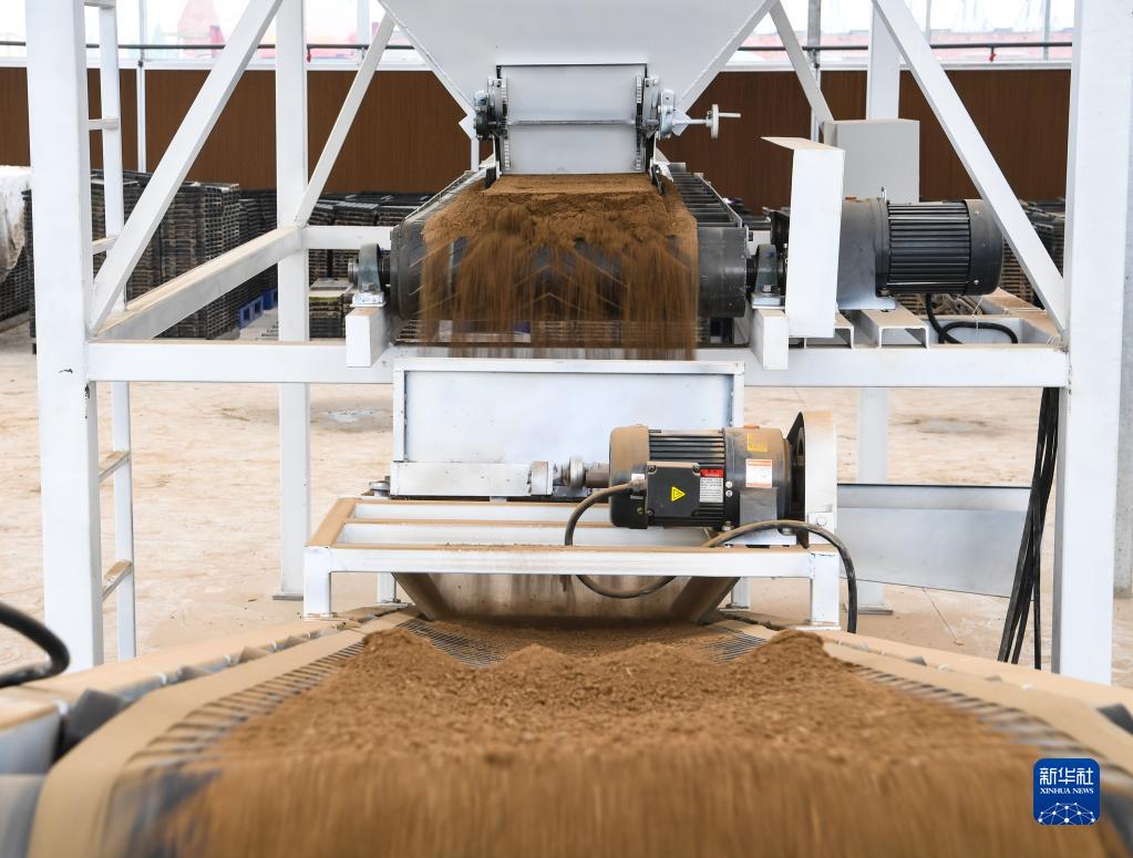 4月20日,在彭山區公義鎮,智能水稻育秧播種流水線上的上土機通過感應裝置添加培土。
