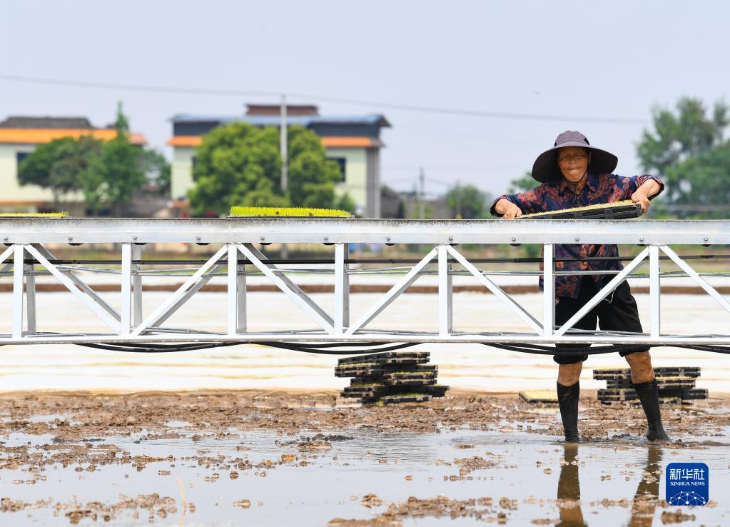 4月20日,在彭山區公義鎮的數智水稻示范基地,工人在秧盤智能傳輸帶上轉運育秧盤。