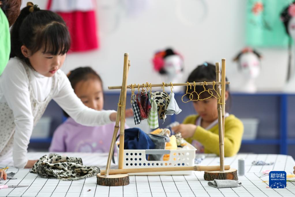 4月20日,小朋友們在給木偶玩具制做服飾。