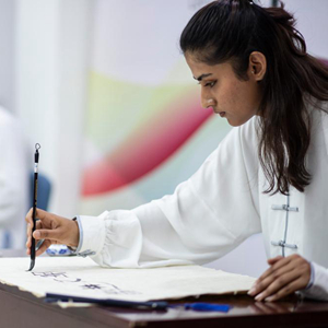 4月20日,在尼泊爾加德滿都,一名學生在聯合國中文日活動上表演毛筆書法。