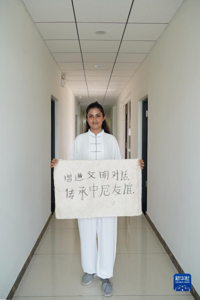 4月20日,在尼泊爾加德滿都,一名學生展示毛筆書法作品。