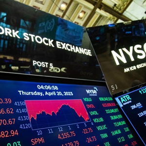4月20日,美國紐約證券交易所屏幕上顯示股票指數信息。