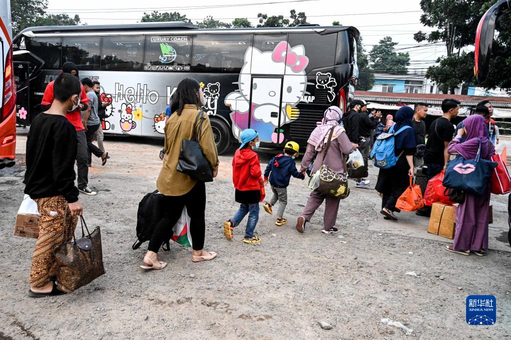 4月18日,人們在印度尼西亞雅加達登上返鄉的大巴車。