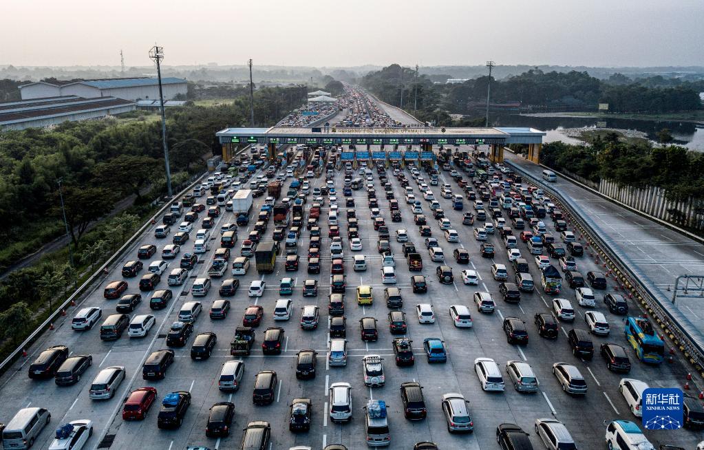 4月19日,印度尼西亞加拉璜一處道路收費站排起長龍(無人機照片)。