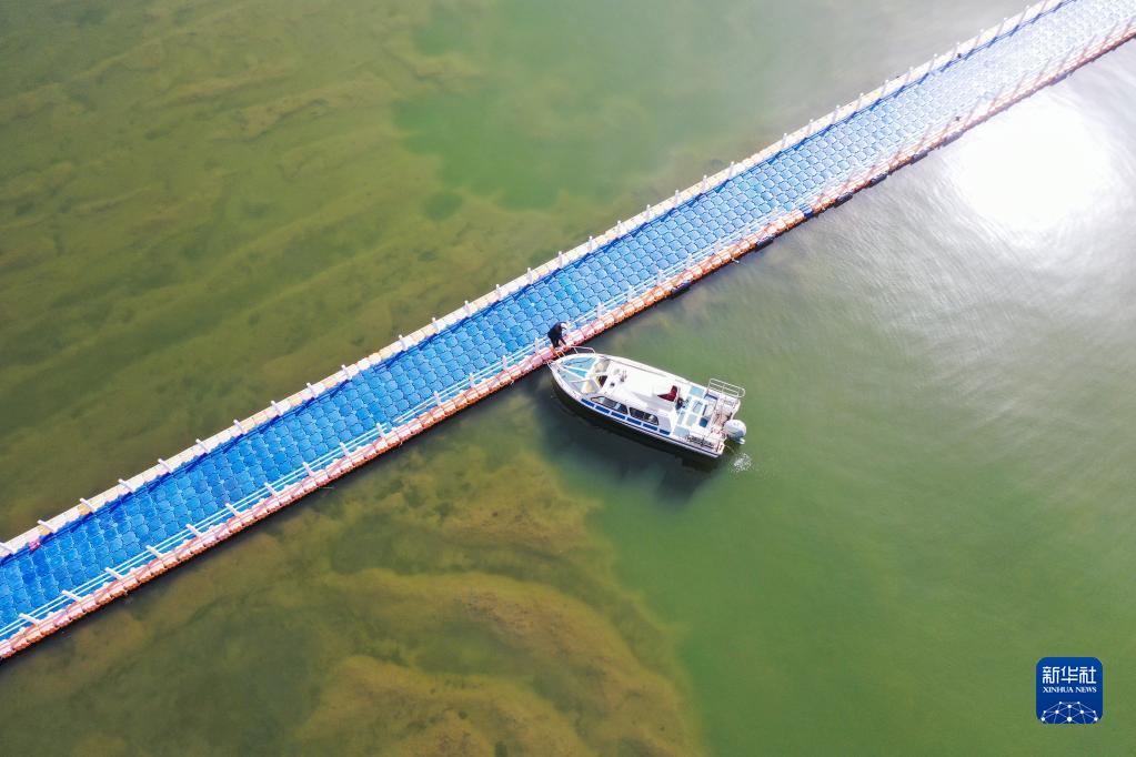 4月19日,胡登雨在岱海一處碼頭停船(無人機照片)。