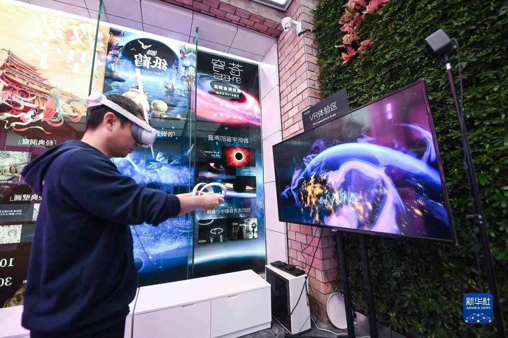 4月21日,一名讀者在嘉興市圖書館元宇宙閱讀體驗館通過VR設備了解宇宙知識。