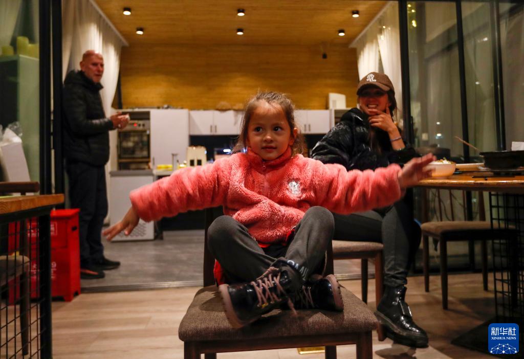 阿明和妻子黃瓊觀看女兒阿琳娜(中)為民宿客人表演節目(3月23日攝)。