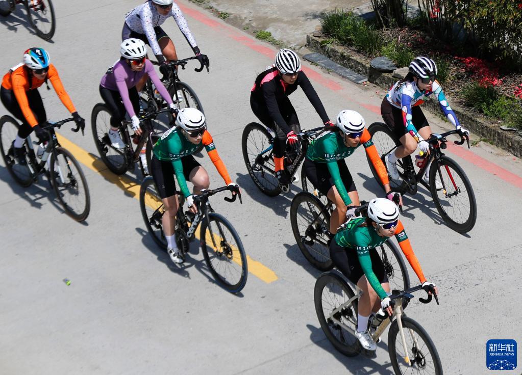 謝敏儀(右三)和隊友在女子公路自行車精英組比賽中進行戰術配合(3月26日攝)。