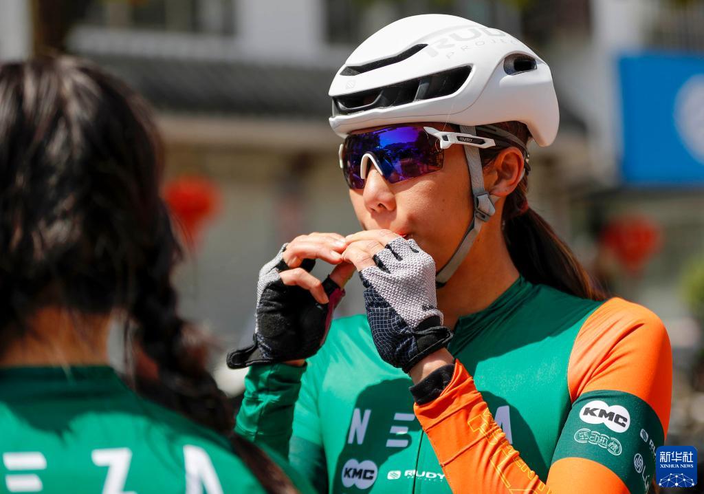 謝敏儀參加女子公路自行車賽精英組比賽時,在兩賽段間休整(3月26日攝)。