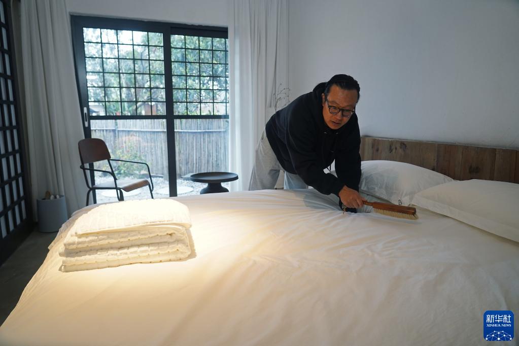 劉龍在民宿里打掃房間衛生(3月29日攝)。