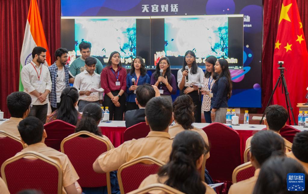 4月20日,印度青少年在位于新德里的中國駐印度大使館參加天宮對話——神舟十五號航天員乘組與上海合作組織國家青少年問答活動時唱歌。
