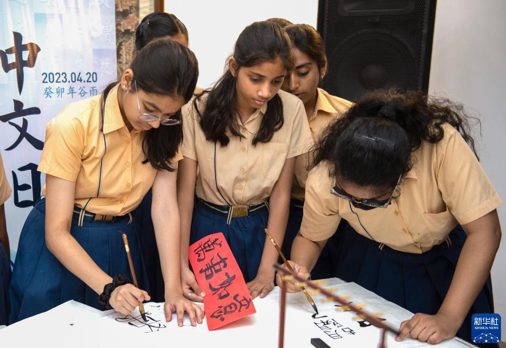 4月20日,印度青少年在位于新德里的中國駐印度大使館參加天宮對話——神舟十五號航天員乘組與上海合作組織國家青少年問答活動時書寫中文。