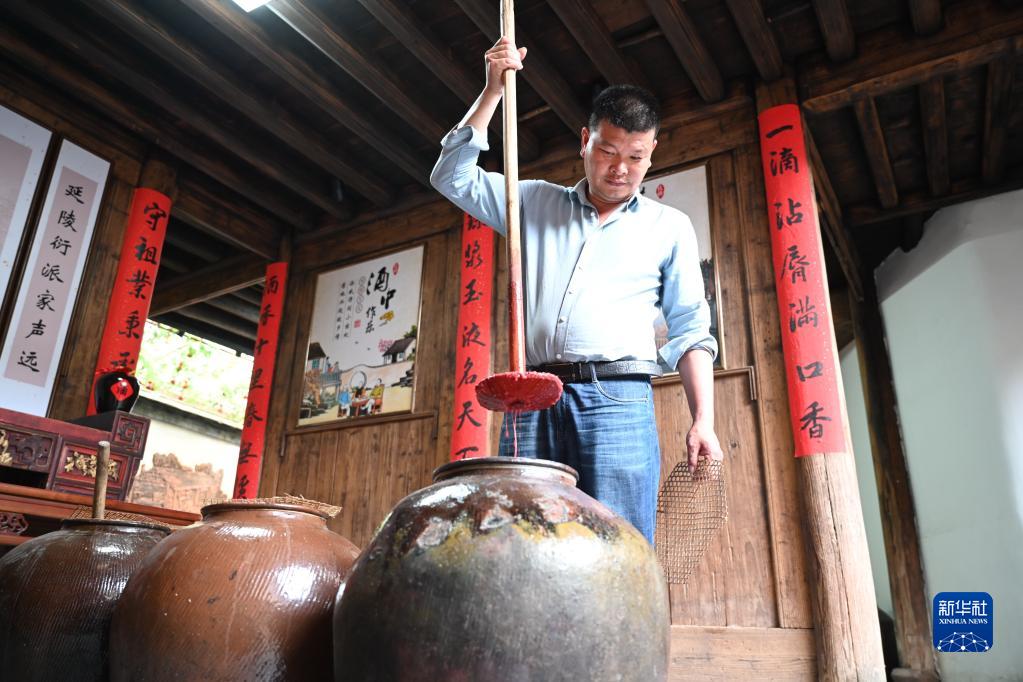 4月20日,村民吳善弟在屏南縣代溪鎮北墘村的黃酒技藝體驗館里展示釀酒過程。