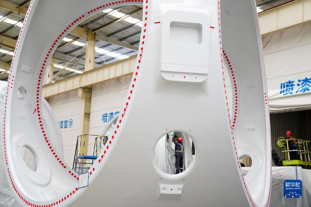 4月20日,在惠民縣風電裝備制造產業園涂裝車間,工人在涂裝風電輪轂。