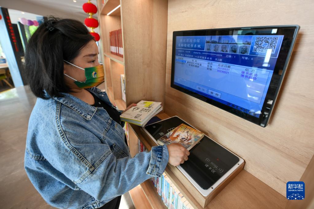 一名市民在張家港市益空間·湖畔書房內通過自助借還書系統借閱圖書(4月20日攝)。