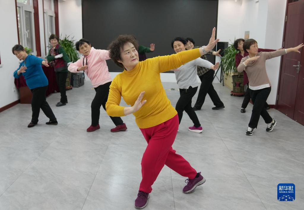 4月21日,老年人在秦皇島市北戴河區安居社區日間照料服務中心排練“五一”聯歡節目。