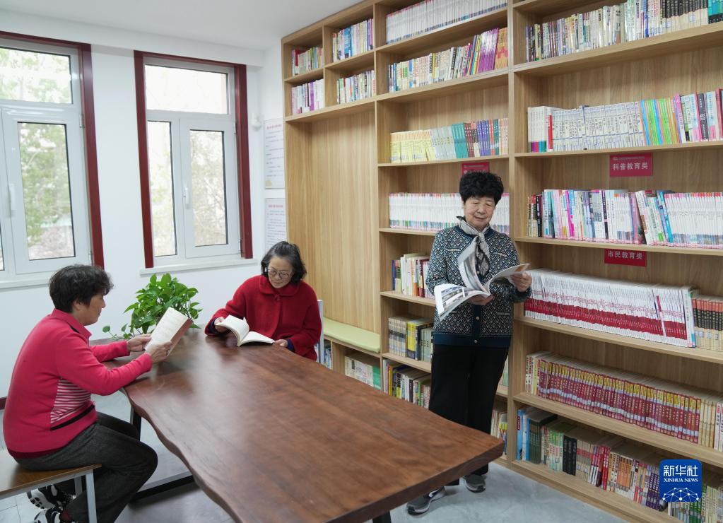 4月21日,三位老人在秦皇島市北戴河區安居社區日間照料服務中心圖書室翻閱圖書。