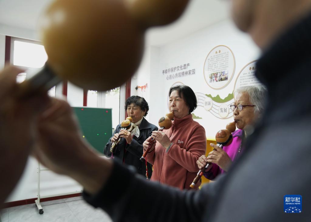 4月21日,秦皇島市北戴河區安居社區幾位老年人在日間照料服務中心練習演奏葫蘆絲。