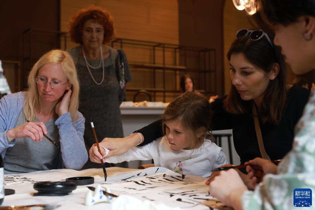 4月20日,在斯洛文尼亞盧布爾雅那,人們在聯合國中文日慶?;顒由象w驗書法。