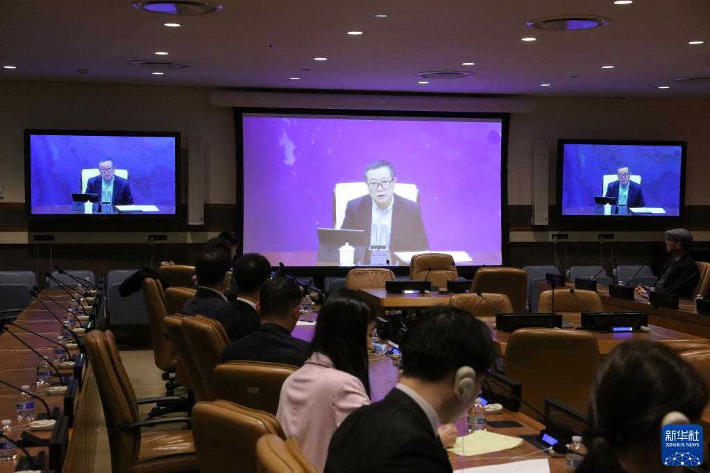 4月20日,在位于紐約的聯合國總部,中國科幻作家劉慈欣(屏幕)以視頻方式出席聯合國中文日“科幻文學與可持續未來”交流會。