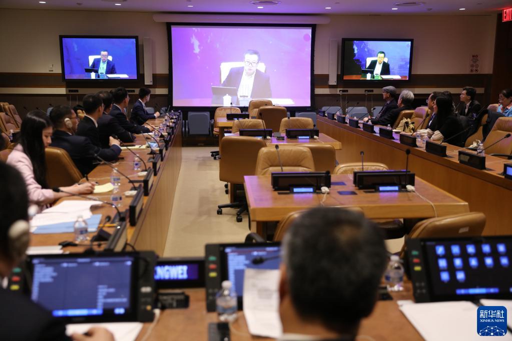 4月20日,在位于紐約的聯合國總部,中國科幻作家劉慈欣(屏幕)以視頻方式出席聯合國中文日“科幻文學與可持續未來”交流會。