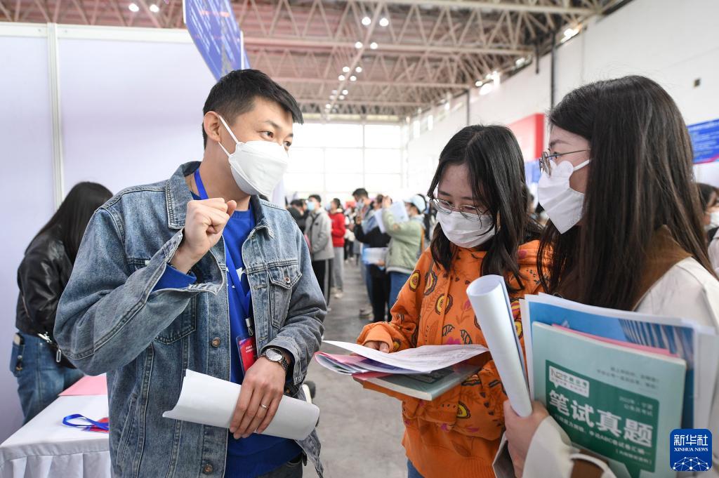 4月21日,求職者(右)在招聘會現場與用人單位工作人員交流。